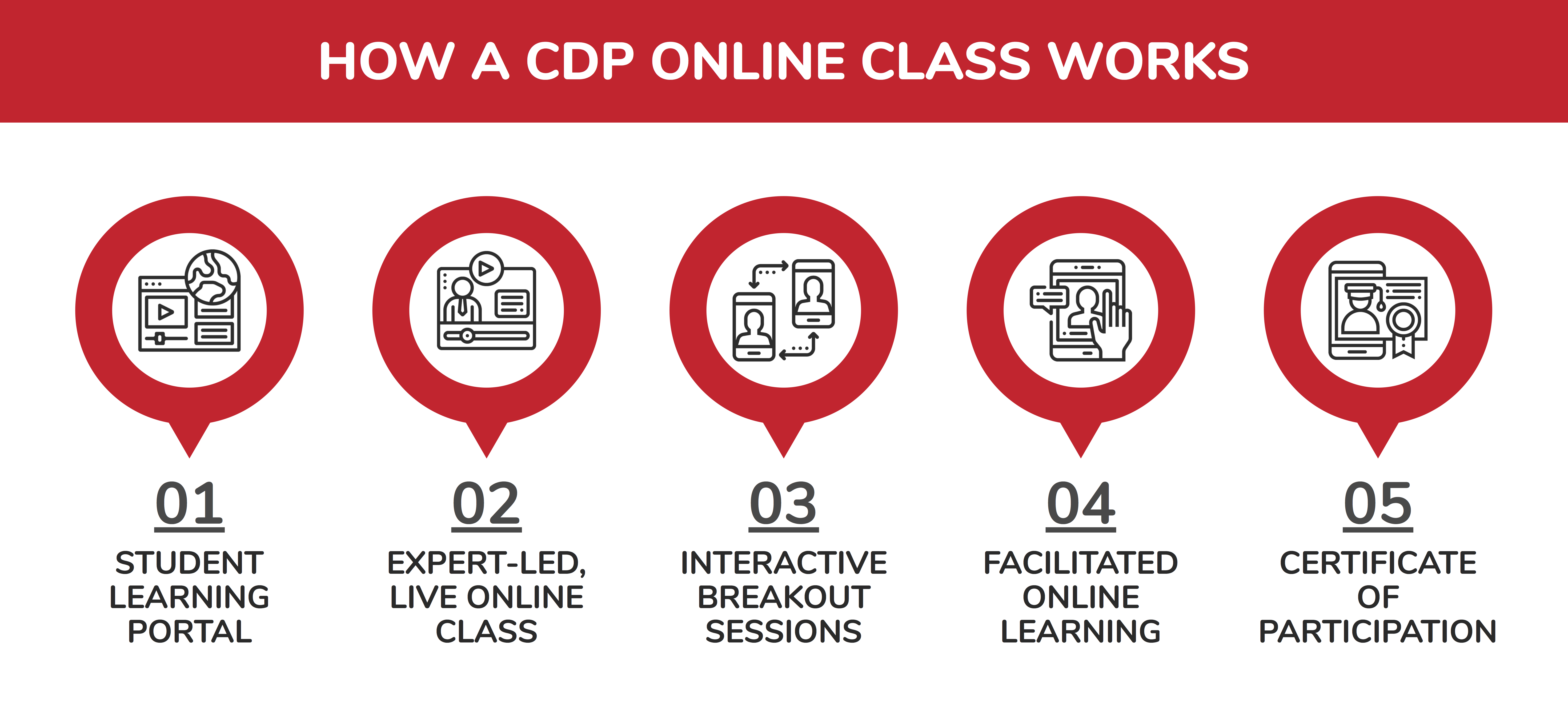Throughout your live online classes, your CDP Facilitators will be present to guide and assist you in your learning. They are available to make sure that all students are engaged, moderated, and supported for the best student experience.