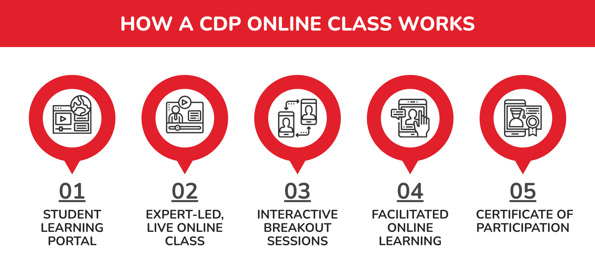 CDP’s Online Masterclass is designed using the same Understanding by Design (UBD), instructor-led principle that we are known for. You are getting the same credibility, integrity, and the highest standard of digital education and will allow you to network with and be part of a growing community of like-minded professionals and life long learners.